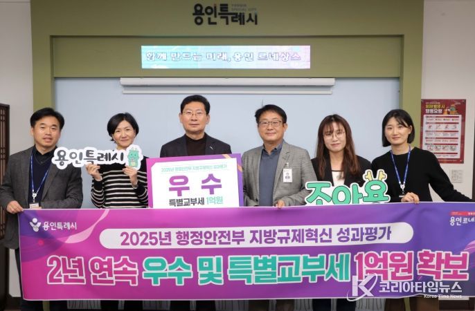 코리아타임뉴스 사회팀 | 용인특례시는 지난해에 이어 ‘지방규제혁신 성과평가’에서 우수 기관으로 선정돼 특별교부세 1억 원을 확보했다고 16일 밝혔다.