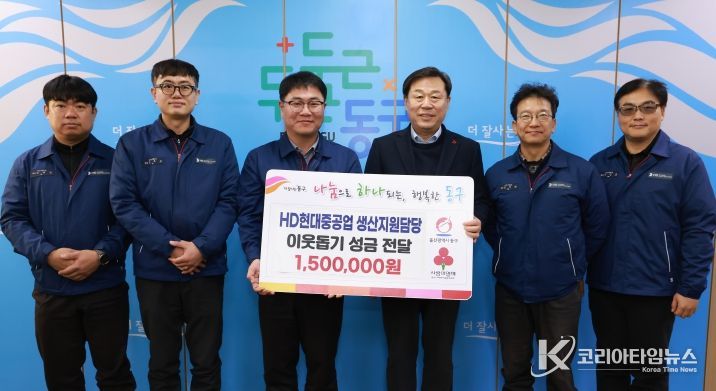 코리아타임뉴스 울산취재본부 | HD현대중공업 생산지원담당(부서장 박필용 수석)은 1월 16일 오전 10시 동구청을 방문해 이웃돕기 성금 150만 원을 전달했다.