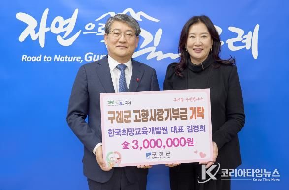 코리아타임뉴스 전남취재본부 | 구례군은 지난 15일 한국희망교육개발원 김경희 대표가 고향사랑기부금 300만원을 구례군에 기탁했다고 밝혔다.