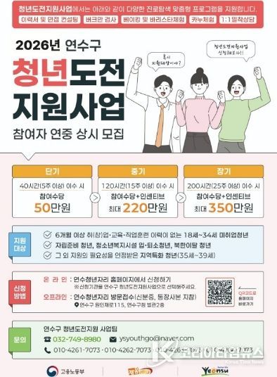 코리아타임뉴스 이아름 기자 | 연수구는 청년들의 경제 활동과 노동시장 진입을 돕기 위해 ‘2026년 청년도전지원사업’ 참여자를 모집한다.