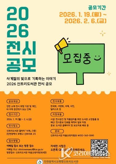 코리아타임뉴스 사회팀 | 인천광역시교육청신트리도서관(관장 정경애)은 지역 문화예술 활성화와 시민의 문화 향유 기회 확대를 위해 2026년 갤러리 ‘사계’ 전시 작품을 모집한다.