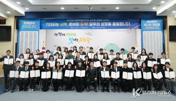 코리아타임뉴스 노승선 기자 | 제주특별자치도는 19일 오전 도청 탐라홀에서 ‘2026년 상반기 정기인사 임용장 수여식’을 개최하고 민선 8기 성과 완성을 위한 조직 정비를 마무리했다.