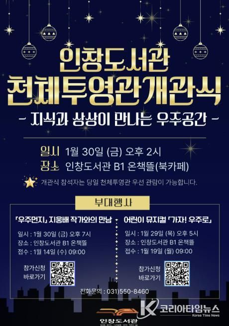 코리아타임뉴스 경기취재본부 | 구리시는 오는 1월 30일 오후 2시 인창도서관 지하 북카페에서 주요 내빈이 참석한 가운데 4층 야외에 조성된 인창도서관 천체투영관 개관식을 개최한다고 밝혔다.