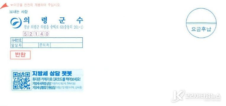 코리아타임뉴스 경남취재본부 | 의령군은 지방세 고지서 전면에 ‘지방세 챗봇 상담서비스’ QR코드를 삽입해 발송한다고 밝혔다.
