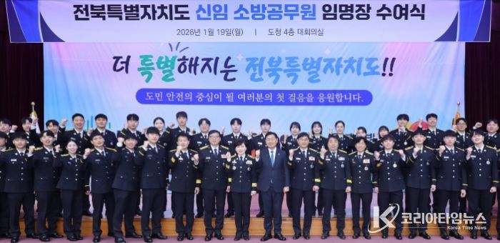 코리아타임뉴스 김태훈 기자 | 전북특별자치도는 19일 도청 4층 대회의실에서 2026년 신임 소방공무원 임명장 수여식을 열고, 도민의 생명과 안전을 지킬 신임 소방공무원 45명을 공식 임명했다.