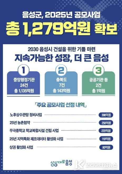코리아타임뉴스 충북취재본부 | 음성군이 정부의 긴축 재정 기조와 공모사업 축소라는 악조건 속에서도 전략적인 행정력을 발휘하며 괄목할 만한 성과를 거뒀다.