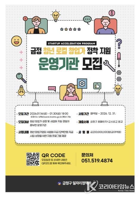 코리아타임뉴스 부산취재본부 | 부산 금정구는 지역에 정착할 수 있는 청년 로컬 창업가를 육성하기 위해 ‘금정 청년 로컬 창업가 정착 지원’ 사업을 추진하고, 이를 운영할 운영기관(보조사업자)을 공개 모집한다고 밝혔다.