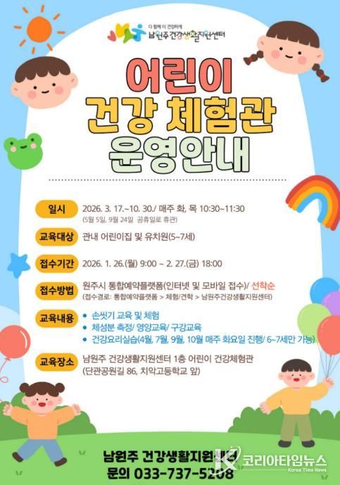 코리아타임뉴스 이아름 기자 | 남원주건강생활지원센터는 손 씻기, 영양 등을 주제로 미취학 아동들에게 건강 교육을 제공하는 ‘어린이 건강체험관’을 운영하고 있다.