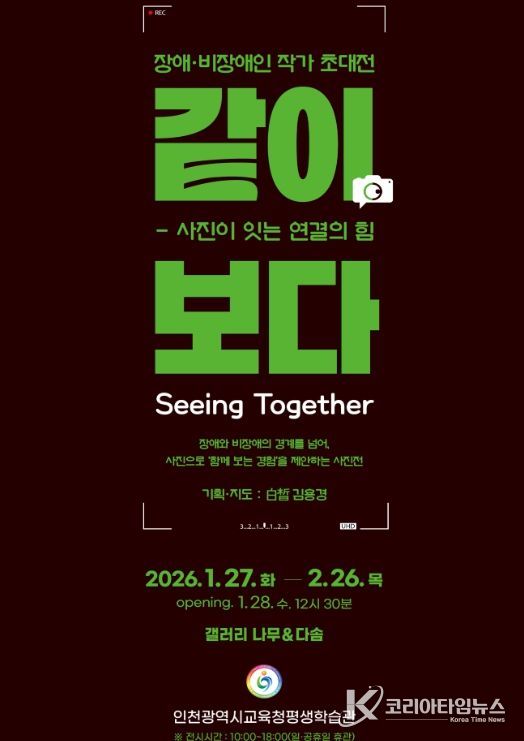 코리아타임뉴스 사회팀 | 인천광역시교육청평생학습관은 인천 시민을 대상으로 2층 갤러리 나무와 다솜에서 ‘같이, 보다(Seeing Together) 장애인 작가 초대전’을 개최한다.