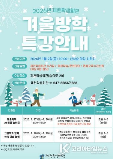 코리아타임뉴스 사회팀 | 제천학생회관은 겨울방학을 맞아 인공지능(AI)을 활용한 디지털 창작 활동 및 그림책을 연계한 미술 놀이 프로그램 등 창의·예술 체험 중심의 특별 프로그램을 운영한다.