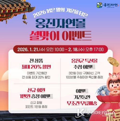 코리아타임뉴스 사회팀 | 옹진군은 설 명절을 맞아 지역 특산물 온라인 판로 확대와 옹진자연몰 이용 활성화를 위해 '옹진자연몰 설날맞이 할인행사'를 오는 1월 21일부터 2월 18일까지 총 29일간 운영한다고 밝혔다.