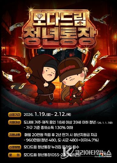 코리아타임뉴스 경남취재본부 | 거제시은 청년들의 자산 형성을 지원해 경제적 자립 기반을 마련하고 장기 재직과 지역 정착을 유도하기 위해 '2026년 모다드림 청년통장 지원사업'상반기 참여자(43명)를 1월 19일부터 2월 12일까지 모집한다.