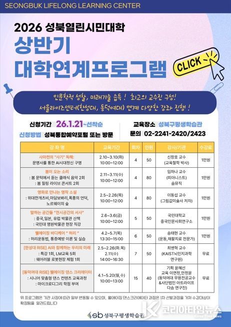 코리아타임뉴스 사회팀 | 서울 성북구가 2월부터 5월까지 구민을 대상으로 ‘2026 상반기 열린시민대학’을 운영한다.