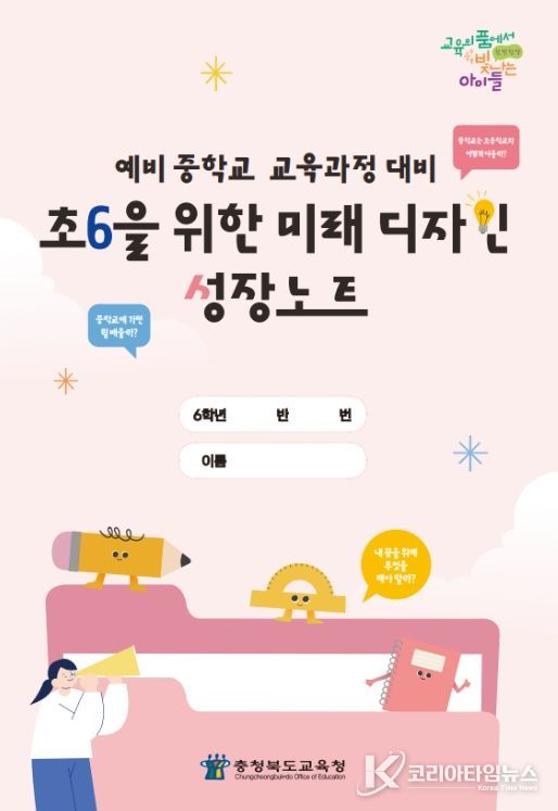 코리아타임뉴스 사회팀 | 충청북도교육청은 초등학교 6학년 학생들의 중학교 진학 준비와 진로 설계를 돕기 위해〈예비 중학교 교육과정 대비 초6을 위한 미래 디자인 성장노트'를 제작해 도내 모든 초등학교에 책자로 보급했다고 밝혔다.