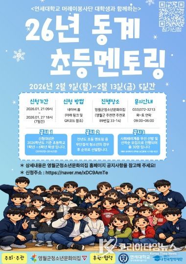코리아타임뉴스 이아름 기자 | 영월군청소년문화의집은 오는 2월 9일부터 13일까지 5일간 영월 관내 초등학생을 대상으로 ‘2026년 동계 초등멘토링 프로그램’을 운영한다고 밝혔다.