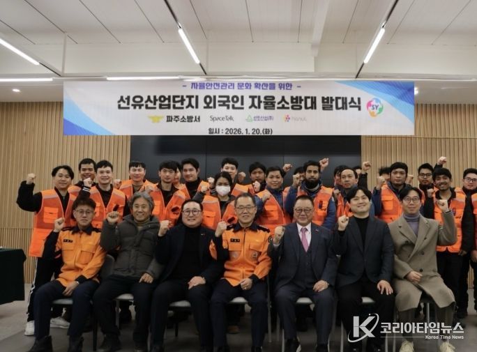 코리아타임뉴스 김태훈 기자 | 파주소방서는 1월 20일 오후 4시, 파주시 문산읍 선유산업단지 내 스페이스톡에서 외국인 근로자 자율소방대 발대식을 열었다. 이번 행사는 겨울철 화재위험이 높은 시기에 외국인 고용사업장의 자율안전관리 역량을 높이기 위한 취지로 마련됐다.