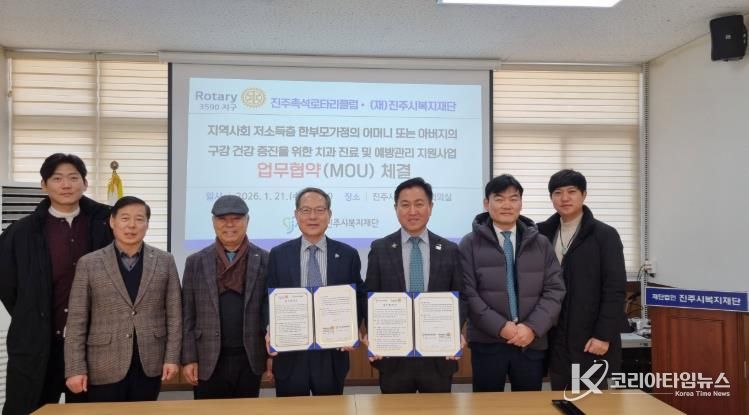 코리아타임뉴스 경남취재본부 | 진주시복지재단은 21일 진주시복지재단에서 국제로타리 3590지구 진주촉석로타리클럽과 저소득 한부모 가정의 구강 건강 증진을 위한 업무협약(MOU)을 체결했다.