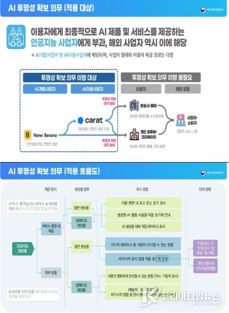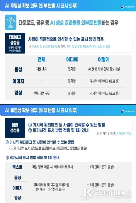 코리아타임뉴스 오영주 기자 | 과학기술정보통신부는 1월 22일'인공지능 발전과 신뢰 기반 조성 등에 관한 기본법' ‘인공지능 기본법’)상 투명성 확보 의무(제31조)의 구체적인 이행 방안을 담은'인공지능 투명성 확보 안내 지침(가이드라인)'을 공개했다.