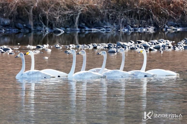 코리아타임뉴스 박찬식 기자 | 충북 괴산 달천강에 내려앉은 ‘겨울 진객’… 큰고니 가족의 평화로운 외출청정 괴산의 생태 지표로 주목영하권 추위가 몰아친 충북 괴산군 달천강변에 반가운 손님이 찾아왔다.