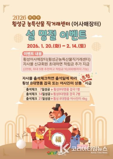 코리아타임뉴스 이아름 기자 | 횡성군 농특산물 직거래센터의 공식 온라인 쇼핑몰인 ‘횡성어사매장터’가 2026년 설 명절을 맞아 지역 농특산물 소비 촉진을 위한 특별 이벤트를 진행한다.