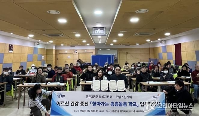 코리아타임뉴스 윤광희 기자 | 파주시 금촌3동은 지난 21일 3층 대회의실에서 관내 로뎀스킨케어와 지역 어르신들의 건강 증진을 위한 사회 공헌 업무 협약을 체결했다.