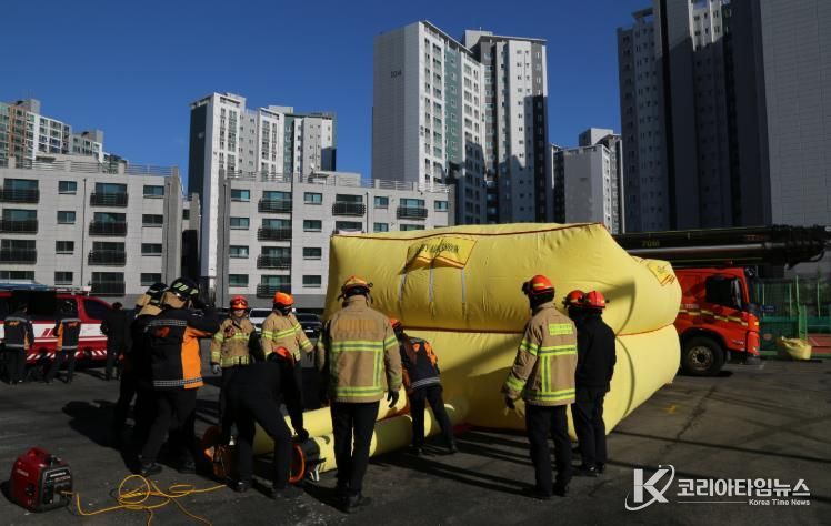 이번 훈련은 화재 발생 등으로 고층부에서 구조대상자의 탈출이 불가피한 상황을 가정해 진행됐으며, 공기안전매트 전개, 송풍기 연결, 설치 완료까지의 소요 시간 단축, 설치 후 안전 점검 절차를 중점적으로 숙달하는 데 목적을 두었다.