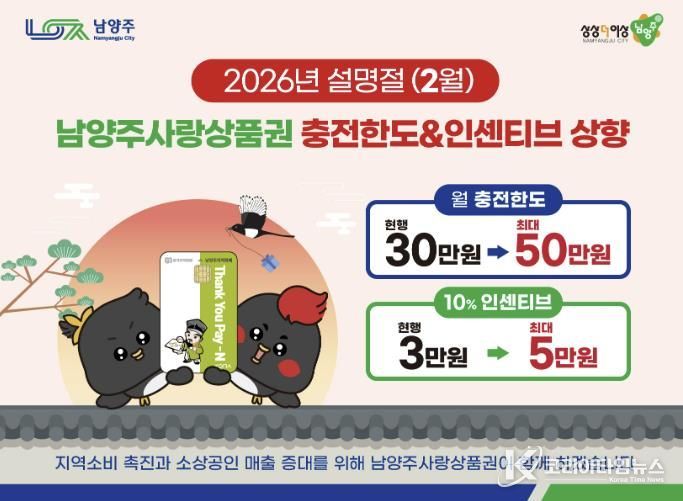 코리아타임뉴스 경기취재본부 | 남양주시는 설 명절을 맞아 2월 한 달간 남양주사랑상품권(지역화폐) 인센티브 혜택을 확대 운영한다고 26일 밝혔다.