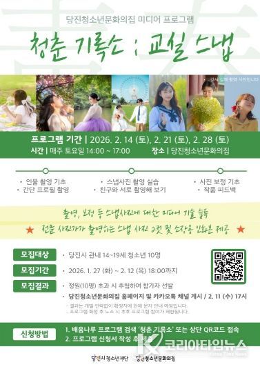 코리아타임뉴스 김택호 기자 | (재)당진시청소년재단 당진청소년문화의집(관장 유수민)은 오는 2월 14일부터 28일까지 매주 토요일, 14시부터 17시까지 관내 14~19세 청소년을 대상으로 미디어 프로그램 [청춘 기록소 : 교실 스냅]을 운영할 예정이다.