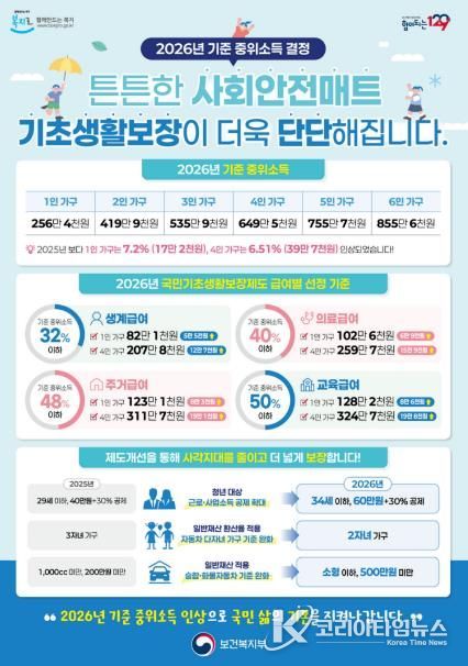 2026년도 기준 중위소득은 1인 가구 기준 256만 4천 원으로, 지난해 239만 2천 원 대비 7.2% 인상된다. 이에 따라 1인 가구의 기초생계급여 지원액도 기존 76만 5천 원에서 82만 원으로 상향 조정된다.