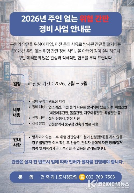 코리아타임뉴스 이아름 기자 | 인천시 중구는 도시 미관을 해치고 안전사고 우려가 있는 노후·방치 간판을 정비하기 위해 ‘2026년도 주인 없는 위험 간판 정비사업’을 본격 추진한다고 28일 밝혔다.