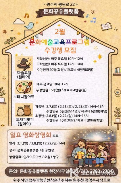 코리아타임뉴스 이아름 기자 | 원주시 문화공유플랫폼에서 ‘문화예술 교육 프로그램’ 수강생을 모집한다.