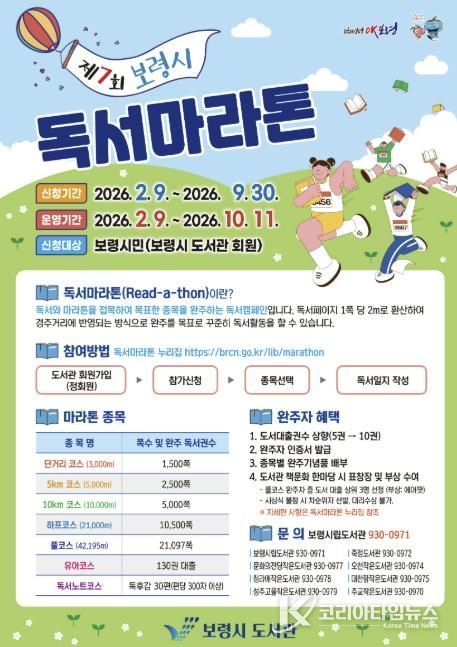 코리아타임뉴스 충남취재본부 | 보령시는 시민들의 독서 문화 활성화를 위해 오는 2월 9일부터 10월 11일까지 245일간 ‘제7회 독서마라톤’을 개최한다.