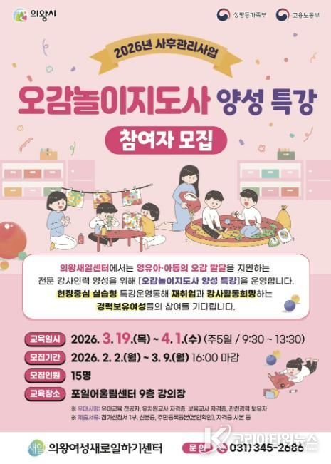 코리아타임뉴스 윤광희 기자 | 의왕시 여성새로일하기센터가 '오감놀이지도사 양성 특강'의 교육생을 모집한다.