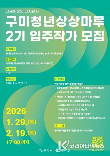 코리아타임뉴스 노승선 기자 | (재)구미문화재단(대표이사 이한석)은 청년 예술인의 창작 역량 강화와 지역 문화예술 활성화를 위해 청년예술인 레지던시 공간인 구미청년상상마루 2기 입주작가를 모집한다.