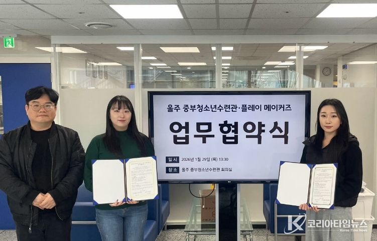 코리아타임뉴스 울산취재본부 | 울주군시설관리공단(이사장 최인식) 중부청소년수련관은 지난 29일, 청소년의 문화예술 감수성 함양과 건강한 공연문화 확산을 위해 전문예술단체‘플레이메이커즈’와 업무협약(MOU)을 체결했다고 밝혔다.