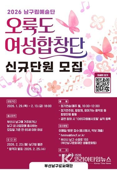 코리아타임뉴스 부산취재본부 | (재)부산남구문화재단은 남구립 오륙도여성합창단의 2026년 신규 합창단원을 1월 29일부터 2월 13일까지 공개 모집한다고 밝혔다.