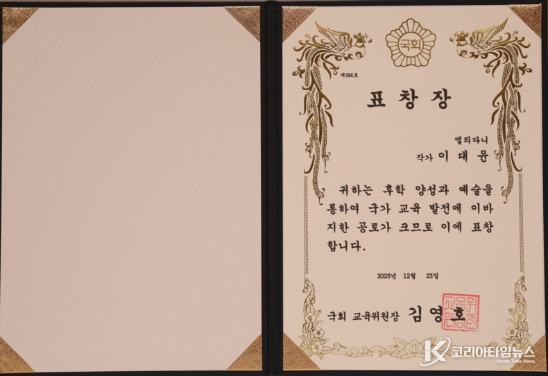 코리아타임뉴스 김택호 기자 | 엘리다니 이대윤 화백이 2025년 12월 23일 한국프레스센터에서 한국시사경제 • 코리아타임뉴스(윤광희 회장)주최, SBS • 기획재정부 • 교육부 • 문화체육관광부 • 농림축산식품부 • 산업통상부 • 기후에너지환경부 • 고용노동부 • 해양수산부 • 중소벤처기업부 후원으로 열린 ‘2025 대한민국 글로벌파워브랜드 대상(GPBA) 및 국회 상임위원장 표창 시상식’ 에서 이대윤 작가가 대상과 국회 교육위원장 표창을 수상했다.