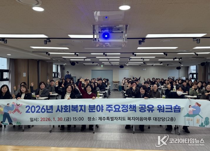 코리아타임뉴스 윤경수 기자 | 제주특별자치도는 지난 30일 제주도 복지이음마루 대강당에서 도와 행정시, 사회복지기관 및 시설, 출자·출연기관 관계자 100여 명이 참석한 가운데 ‘2026년 사회복지 분야 주요 정책 공유 워크숍’을 개최했다.