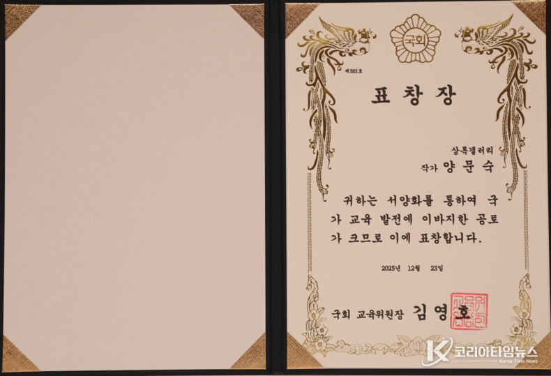 코리아타임뉴스 박찬식 기자 | 상록갤러리 양문숙 관장 2025년 12월 23일 한국프레스센터에서 한국시사경제 • 코리아타임뉴스(윤광희 회장)주최, SBS • 기획재정부 • 교육부 • 문화체육관광부 • 농림축산식품부 • 산업통상부 • 기후에너지환경부 • 고용노동부 • 해양수산부 • 중소벤처기업부 후원으로 열린 ‘2025 대한민국 글로벌파워브랜드 대상(GPBA) 및 국회 상임위원장 표창 시상식’ 에서 양문숙 작가가 대상과 국회 교육위원장 표창을 수상했다.