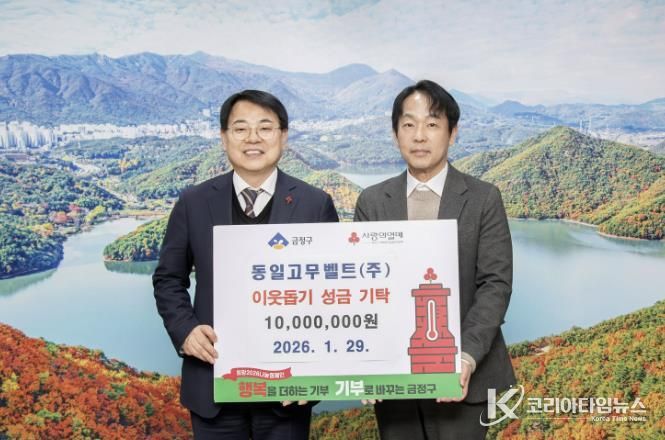 코리아타임뉴스 부산취재본부 | 부산 금정구는 지난 29일 동일고무벨트㈜에서 경제적으로 어려운 지역 청소년들을 위한 ‘금정 희망의 사다리 운동 사업’에 이웃돕기성금 1,000만원을 기탁했다고 밝혔다.