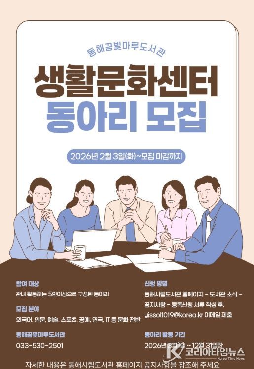 코리아타임뉴스 이아름 기자 | 동해시는 시민들이 동아리(소모임) 활동을 통해 취미와 취향을 발견하고, 지역사회 전반에 자발적인 생활문화가 확산될 수 있도록 '2026년도 꿈빛마루 생활문화센터 동아리 모집'을 시행한다고 밝혔다.