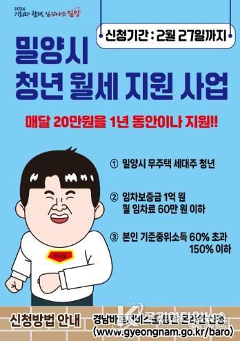 코리아타임뉴스 경남취재본부 | 경남 밀양시는 청년층의 주거비 부담을 줄이고 안정적인 정착을 돕기 위해 2026년 청년 월세 지원사업을 시행하고, 오는 2월 27일까지 희망자를 모집한다.