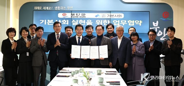 코리아타임뉴스 전북취재본부 | 부안군은 2일 군청 중회의실에서 사단법인 기본사회와 ‘기본사회 실현을 위한 업무협약(MOU)’을 체결하고, 지역 실정에 맞는 기본사회 정책 발굴과 실행을 위한 전략적 협력체계를 구축했다.