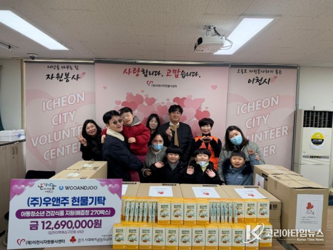 코리아타임뉴스 기동취재팀 | 이천시자원봉사센터는 1월 30일 센터 다목적실에서 ㈜우앤주(대표 송우)의 지원으로 현물 기탁식을 진행했다.