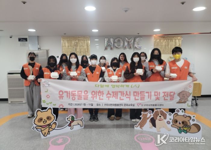 코리아타임뉴스 경기취재본부 | 구리시는 사단법인 구리시자원봉사센터가 구리시 반려돌봄센터와 공동으로 지난 1월 31일, 청소년 15명이 참여한 가운데 유기 동물을 위한 수제 간식 만들기 및 배식 봉사활동을 진행했다고 밝혔다.