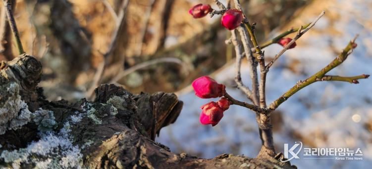 코리아타임뉴스 전남취재본부 | 입춘을 이틀 앞둔 2일, 밤사이 눈이 내린 가운데 광양시청 앞 미관광장 매화동산에서 홍매가 개화했다.