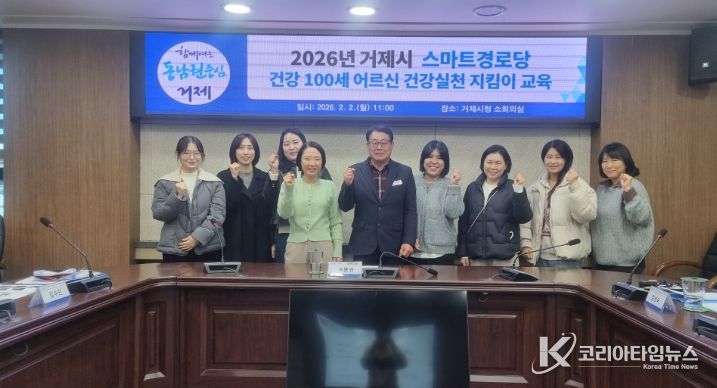 코리아타임뉴스 경남취재본부 | 거제시는 2021년부터 성공적으로 추진해 온 스마트경로당 사업의 일환으로, ‘2026년 건강 100세 어르신 건강실천 지킴이’8명을 2월 2일 참여자 교육을 시작으로 관내 9개면 215개 경로당에 본격 투입한다고 밝혔다.