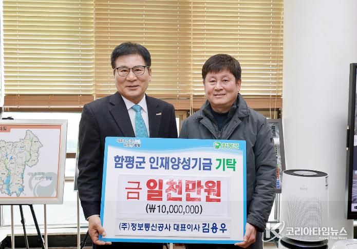 함평군은 “지난 2일 ㈜정보통신공사가 1천만 원을, 한국희망교육개발원(대표 김경희)이 2백만 원을 군 인재양성기금에 기탁했다”고 3일 밝혔다.