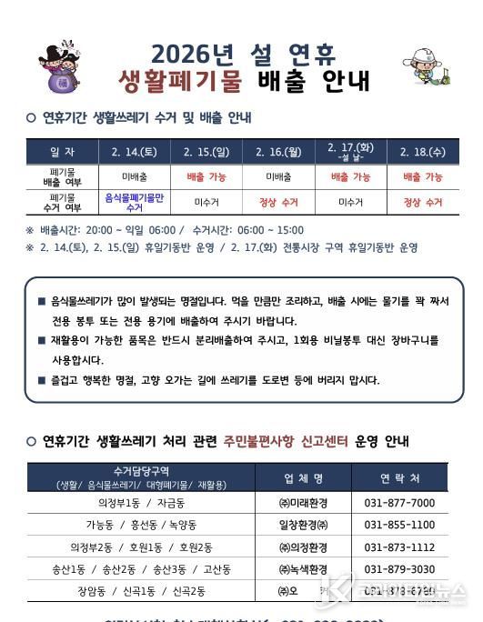 코리아타임뉴스 기동취재팀 | 의정부시는 설 연휴 기간 시민들이 쾌적한 환경에서 명절을 보낼 수 있도록 생활쓰레기 관리대책을 수립하고 청소대책 상황실을 운영한다.