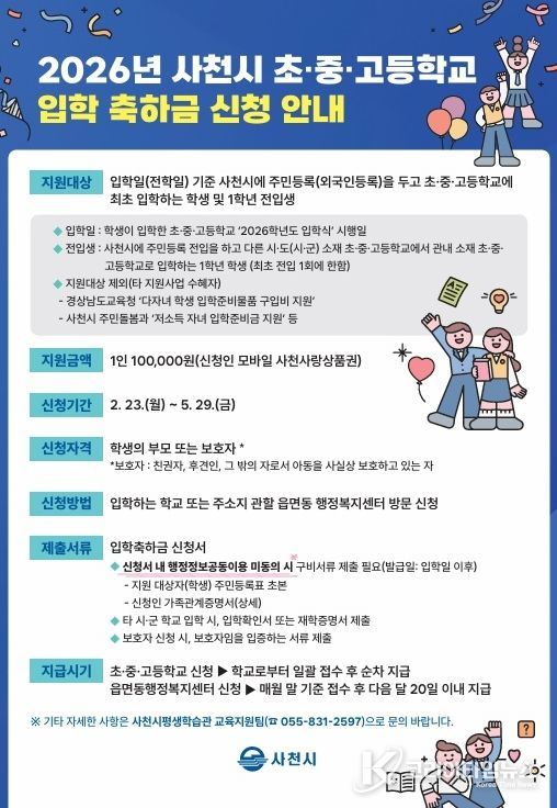 코리아타임뉴스 경남취재본부 | 사천시는 교육복지 강화를 위해 2026년부터 초·중·고등학교 입학 축하금 지원 대상을 확대해 시행한다고 4일 밝혔다.